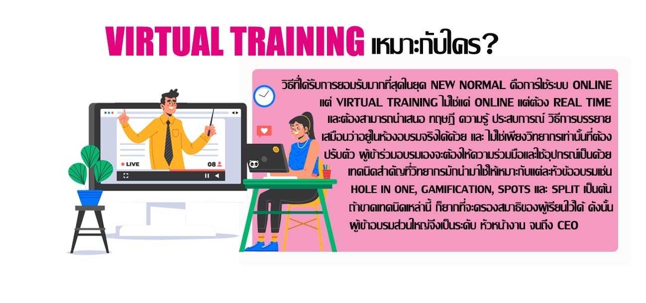 วิธีที่ได้รับการยอมรับมากที่สุดในยุค NEW NORMAL คือการใช้ระบบ ONLINEแต่ VIRTUAL TRAINING ไม่ใช่แค่ ONLINE แต่ต้อง REAL TIME และต้องสามารถนำเสนอ ทฤษฎี ความรู้ ประสบการณ์ วิธีการบรรยายเสมือนว่าอยู่ในห้องอบรมจริงได้ด้วย แล: ไม่ใช่เพียงวิทยากรเท่านั้นที่ต้องปรับตัว ผู้เข้าร่วมอบรมเองจะต้องให้ความร่วมมือและใช้อุปกรณ์เป็นด้วย เทคนิคสำคัญที่วิทยากรมักนำมาใช้ให้เหมาะกับแต่ละหัวข้ออบรมเช่น HOLE IN ONE, GAMIFICATION, SPOTS และ SPLIT เป็นต้น ถ้าขาดเทคนิคเหล่านี้ ก็ยากที่จะครองสมาธิของผู้เรียนไว้ได้ ดังนั้นผู้เข้าอบรมส่วนใหญ่จึงเป็นระดับ หัวหน้างาน จนถึง CEO