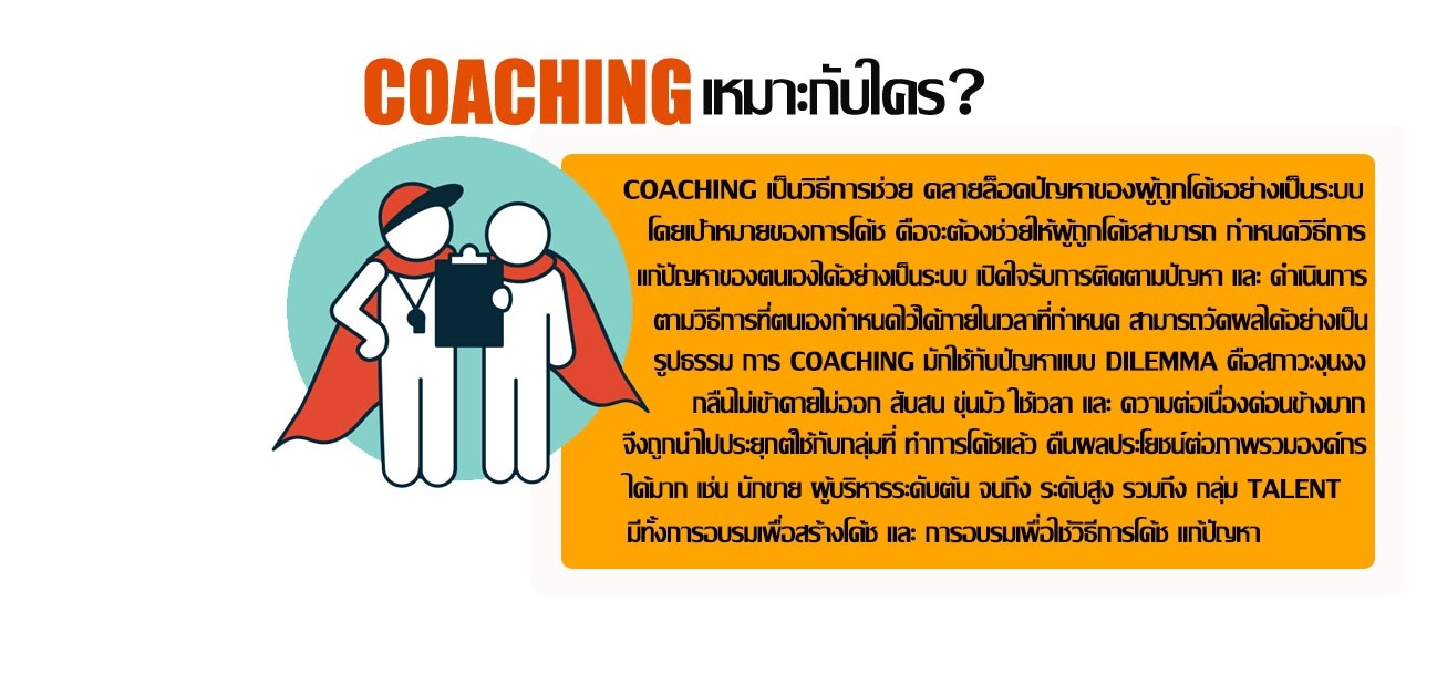 COACHING เป็นวิธีการช่วย คลายล็อกปัญหาของผู้ถูกโค้ชอย่างเป็นระบบโดยเป้าหมายของการโค้ช คือจะต้องช่วยให้ผู้ถูกโค้ชสามารถ กำหนดวิธีการแก้ปัญหาของตนเองได้อย่างเป็นระบบ เปิดใจรับการติดตามปัญหา แล: ดำเนินการตามวิธีการที่ตนเองกำหนดไว้ได้ภายในเวลาที่กำหนด สามารถวัดผลได้อย่างเป็นรูปธรรม การ COACHING มักใช้กับปัญหาแบบ DILEMMA คือสภาวะงุนงงกลืนไม่เข้าคายไม่ออก สับสน ขุ่นมัว ใช้เวลา และ ความต่อเนื่องค่อนข้างมากจึงถูกนำไปประยุกต์ใช้กับกลุ่มที่ ทำการโค้ชแล้ว คืนผลประโยชน์ต่อภาพรวมองค์กรได้มาก เช่น นักขาย ผู้บริหารระดับต้น จนถึง ระดับสูง รวมถึง กลุ่ม TALENT มีทั้งการอบรมเพื่อสร้างโค้ช และ การอบรมเพื่อใช้วิธีการโค้ชแก้ปัญหา
