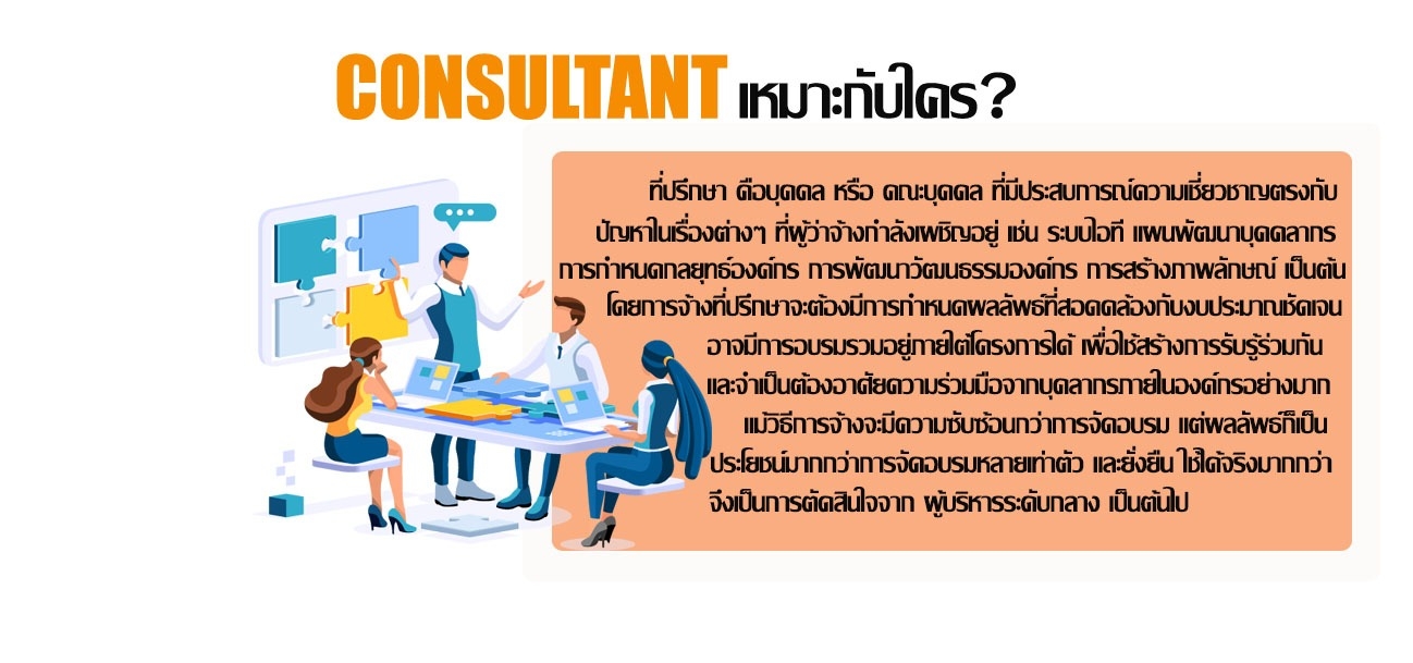 ที่ปรึกษา คือบุคคล หรือ คณะบุคคล ที่มีประสบการณ์ความเชี่ยวชาญตรงกับปัญหาในเรื่องต่างๆ ที่ผู้ว่าจ้างกำลังเผชิญอยู่ เช่น ระบบไอที แผนพัฒนาบุคลากรการกำหนดกลยุทธ์องค์กร การพัฒนาวัฒนธรรมองค์กร การสร้างภาพลักษณ์ เป็นต้น โดยการจ้างที่ปรึกษาจะต้องมีการกำหนดผลลัพธ์ที่สอดคล้องกับงบประมาณชัดเจนอาจมีการอบรมรวมอยู่ภายใต้โครงการได้ เพื่อใช้สร้างการรับรู้ร่วมกันและจำเป็นต้องอาศัยความร่วมมือจากบุคลากรภายในองค์กรอย่างมากแม้วิธีการจ้างจะมีความซับซ้อนกว่าการจัดอบรม แต่ผลลัพธ์ก็เป็นประโยชน์มากกว่าการจัดอบรมหลายเท่าตัว และยั่งยืน ใช้ใด้จริงมากกว่าจึงเป็นการตัดสินใจจาก ผู้บริหารระดับกลาง เป็นต้นไป