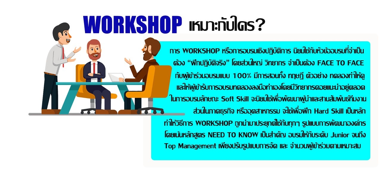 การ WORKSHOP หรือการอบรมเชิงปฏิบัติการ นิยมใช้กับหัวข้ออบรมที่จำเป็นต้อง “ฝึกปฏิบัติจริง” โดยส่วนใหญ่ วิทยากร จำเป็นต้อง FACE TO FACE กับผู้เข้าร่วมอบรมแบบ 100% มีการสอนทั้ง ทฤษฎี ตัวอย่าง ทดลองทำให้ดูและให้ผู้เข้ารับการอบรมทดลองลงมือทำเองโดยมีวิทยากรคอยแนะนำอยู่ตลอดในการอบรมลักษณ: Soft Skil จะนิยมใช้เพื่อพัฒนาผู้นำและสานสัมพันธ์ทีมงานส่วนในภาคธุรกิจ หรืออุตสาหกรรม จะใช้เพื่อฝึก Hard Skill เป็นหลักทำให้วิธีการ WORKSHOP ถูกนำมาประยุกต์ใช้กับทุกๆรูปแบบการพัฒนาองค์กรโดยเน้นหลักสูตร NEED TO KNOW เป็นสำคัญ อบรมให้กับระดับ Junior จนถึง Top Management เพียงปรับรูปแบบการจัด และ จำนวนผู้เข้าร่วมตามเหมาะสม